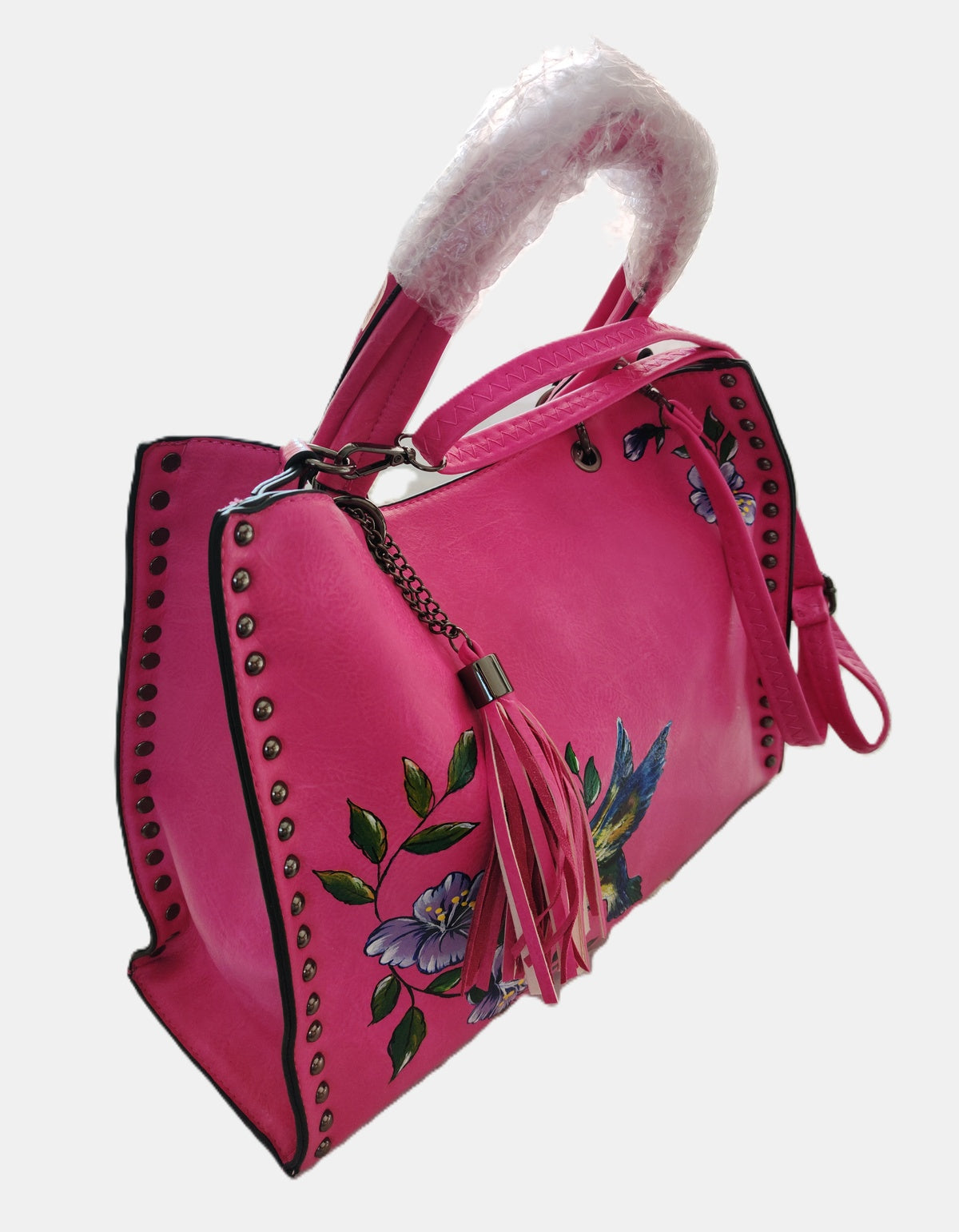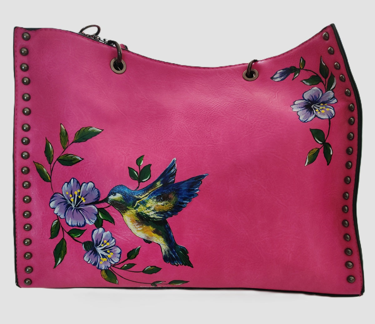 Borsa artigianale con maniglia o tracolla, caratterizzata da una raffinata pittura a mano che ritrae colibrì e motivi floreali su uno sfondo rosa intenso. La combinazione cromatica e l'unicità del design fatto a mano la rendono un accessorio distintivo, particolarmente indicato per eventi speciali dove si desidera un elemento di differenziazione estetica.