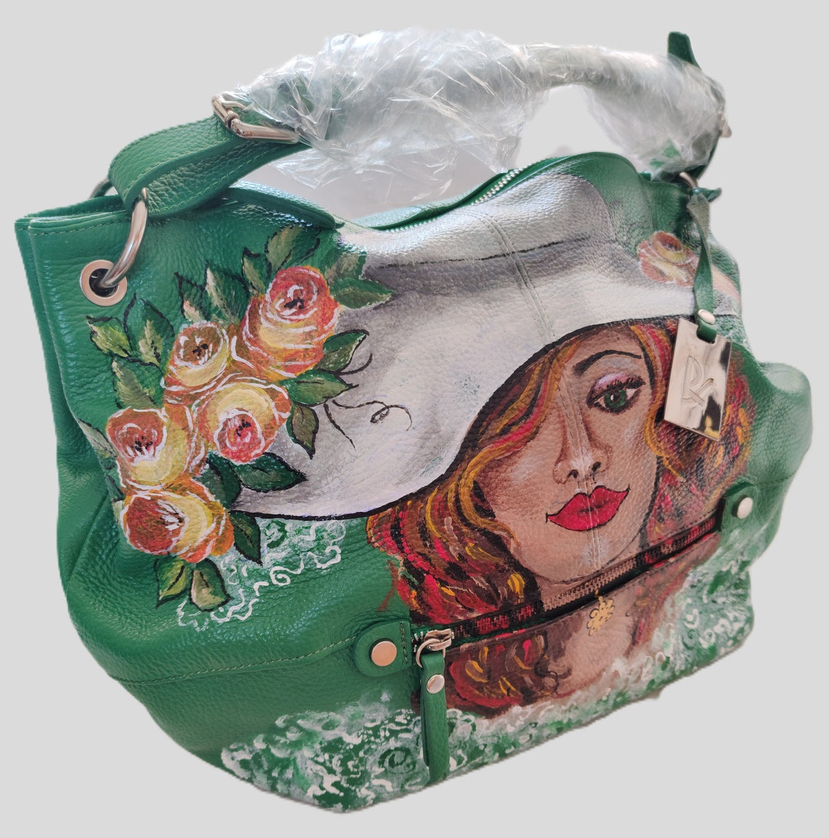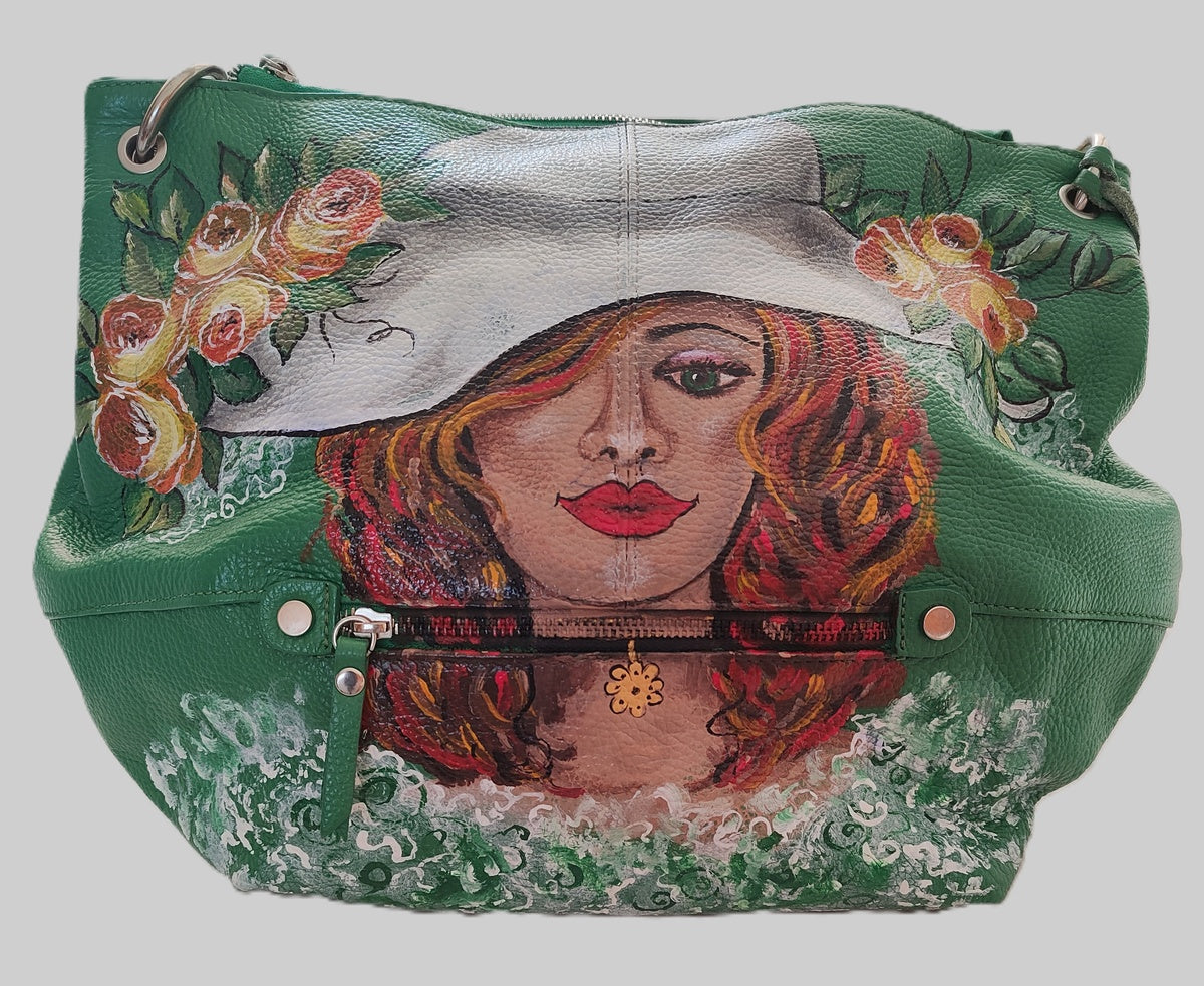 Questa borsa a maniglia o tracolla cattura l'essenza della femminilità attraverso la rappresentazione di una dama con cappello bianco, immersa in tonalità verdi e circondata da fiori dipinti con maestria. Dipinto realizzato interamente a mano, riflette la precisione e la sensibilità artistica caratteristiche dell'artista. Un accessorio distintivo che eleva qualsiasi outfit, ideale per occasioni speciali che meritano di essere celebrate con un tocco di raffinata eleganza.