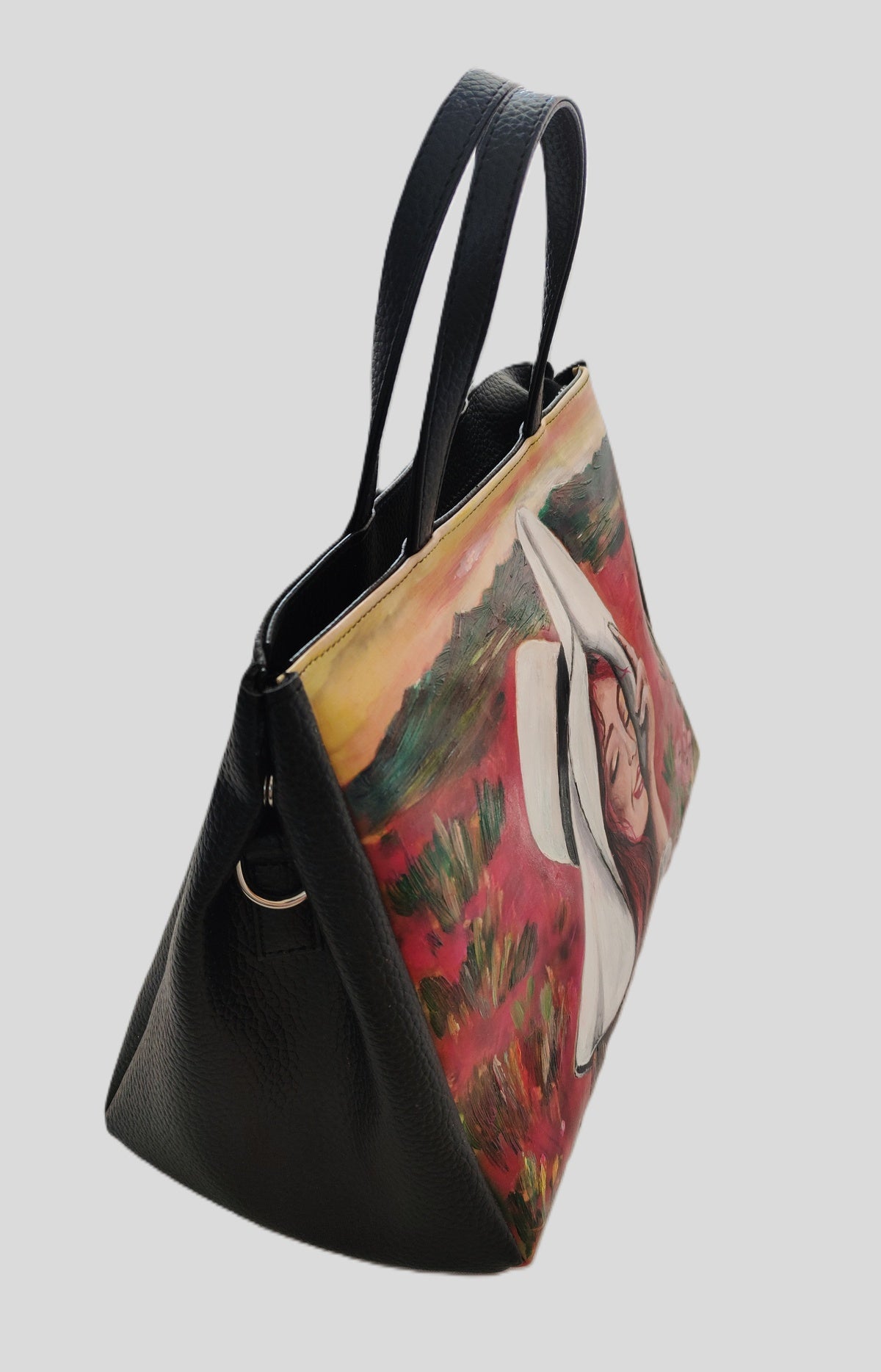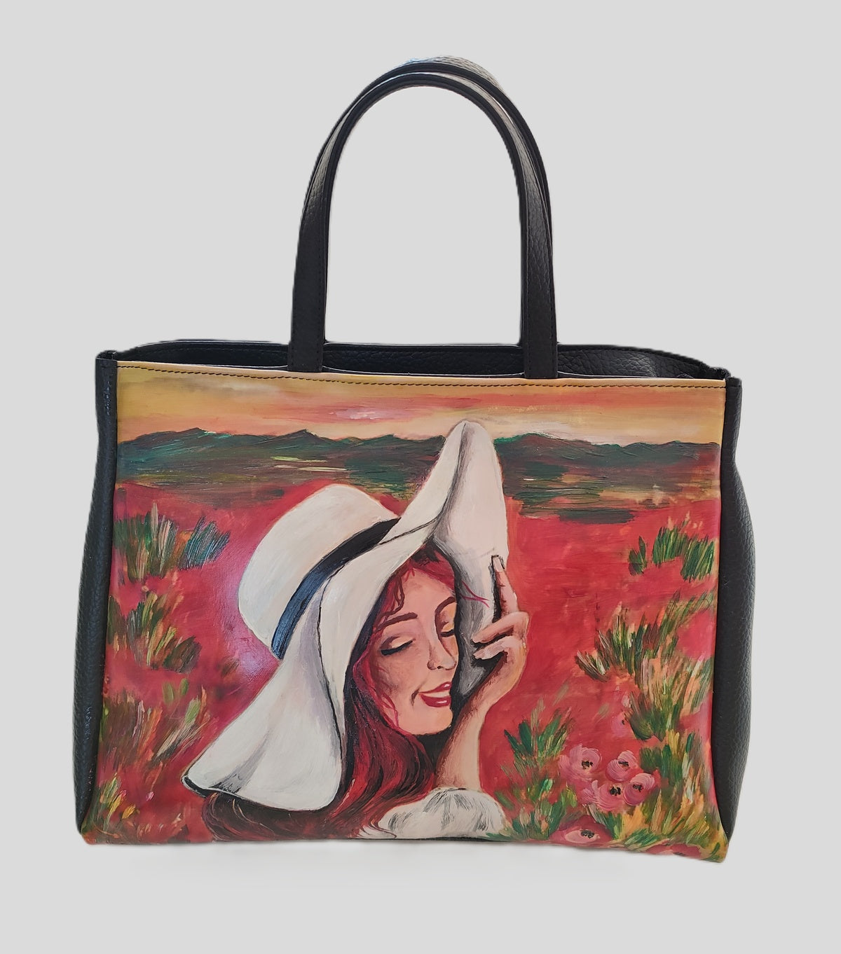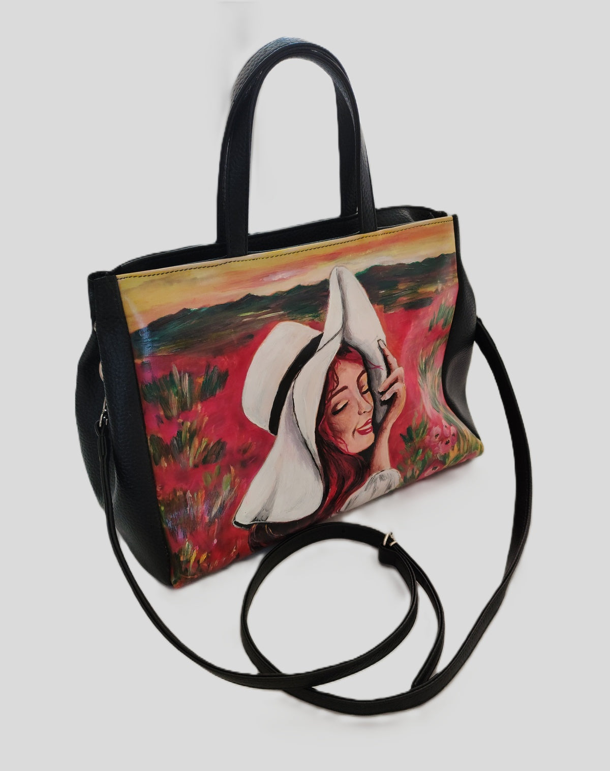Opera dipinta a mano con straordinaria cura e delicatezza, questa borsa tracolla incarna la firma artistica distintiva del creatore. Ogni pennellata sulla raffigurazione della dama nel campo di papaveri rossi rivela un'attenzione meticolosa ai dettagli e una sensibilità artistica raffinata. Un accessorio che trascende la semplice funzionalità per diventare un'autentica espressione d'arte da indossare.