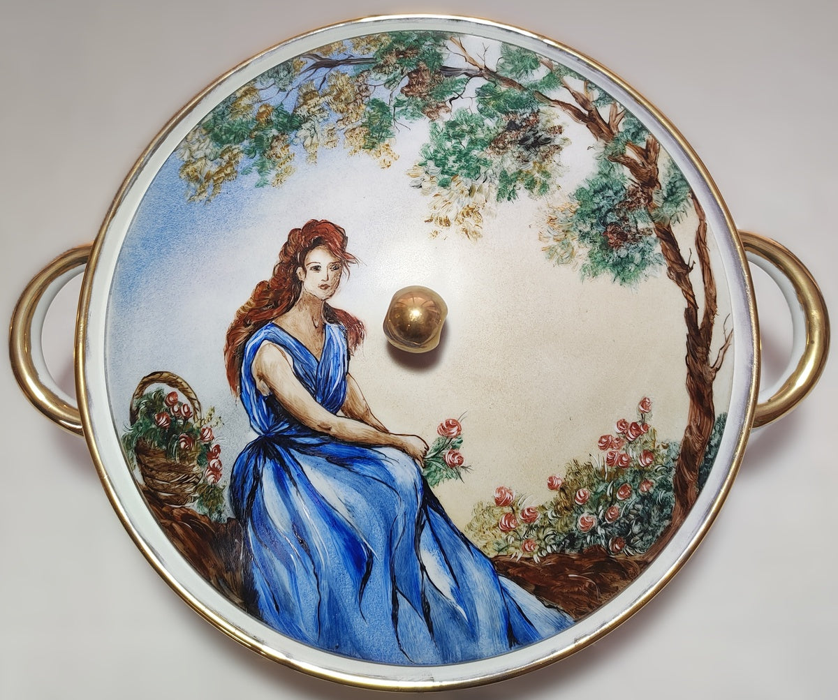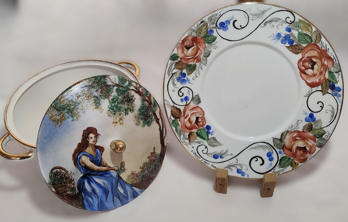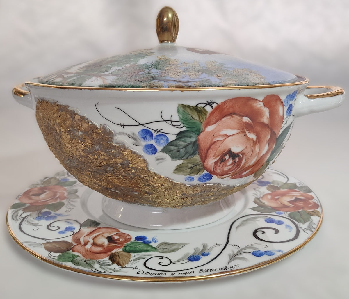 Entra in un mondo di eleganza con il nostro set piatto e zuppiera in porcellana. Realizzata con la tecnica "olio molle cottura terzo fuoco", il piatto è decorato con una ghirlanda di rose e ghirigori neri e sfumature in oro zecchino. La zuppiera ha un coperchio con una raffinata dama seduta tra le rose, mentre il corpo è abbellito con rose e una decorazione in pasta in rilievo color oro. Porta un tocco di classe alla tua tavola con questo centrotavola unico.