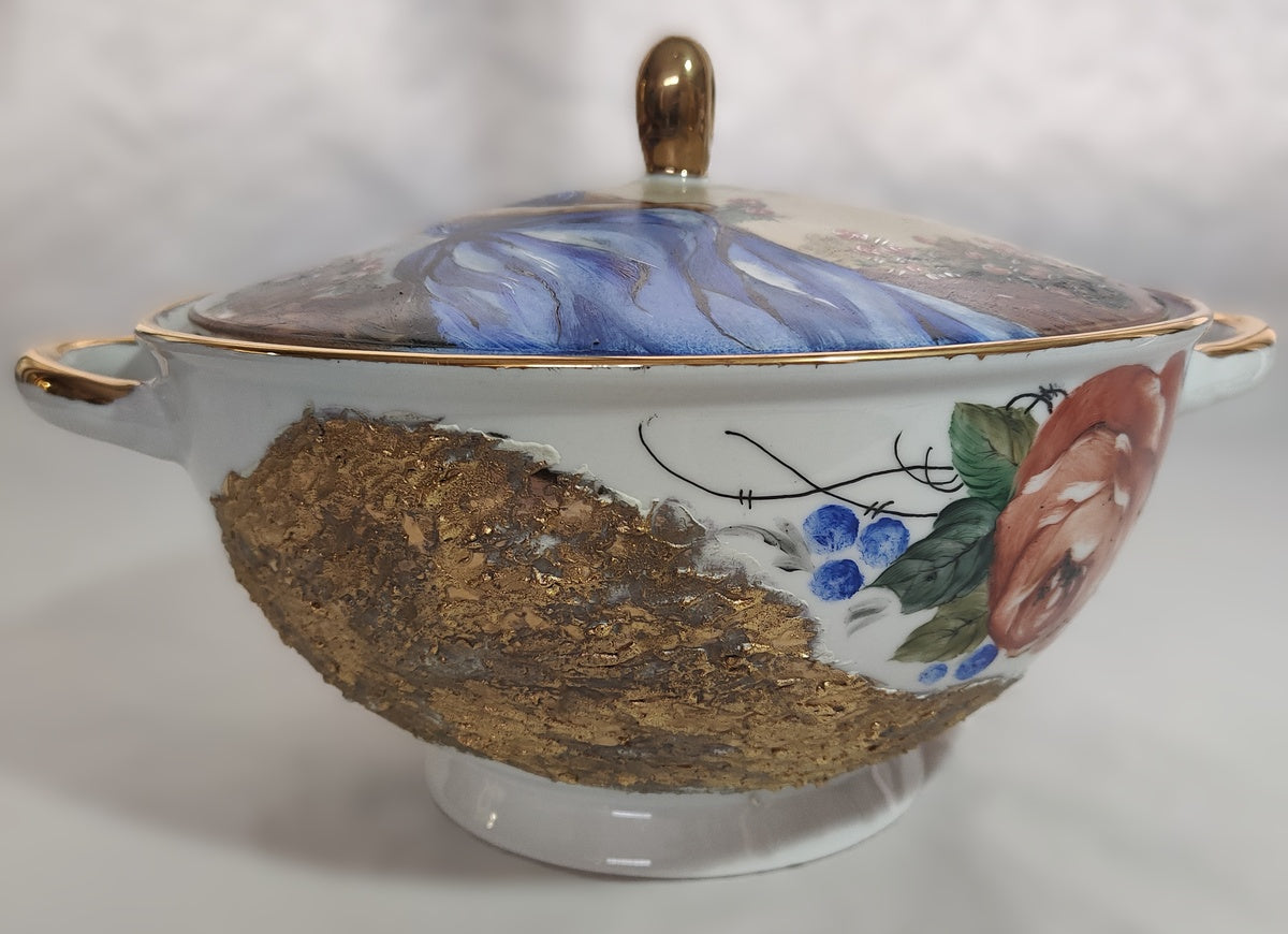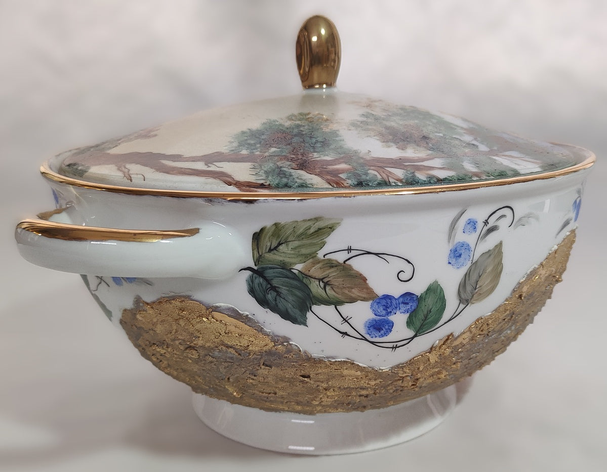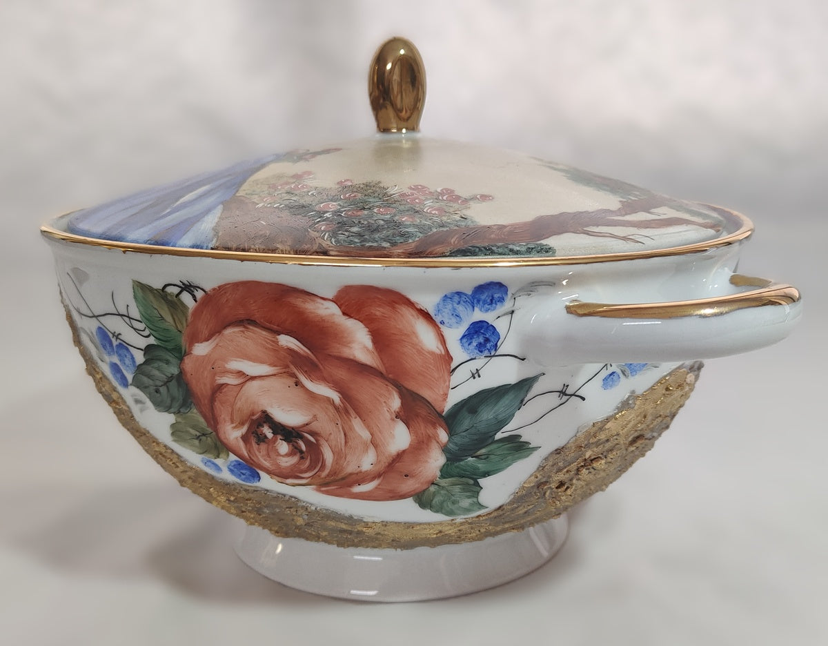 Entra in un mondo di eleganza con il nostro set piatto e zuppiera in porcellana. Realizzata con la tecnica "olio molle cottura terzo fuoco", il piatto è decorato con una ghirlanda di rose e ghirigori neri e sfumature in oro zecchino. La zuppiera ha un coperchio con una raffinata dama seduta tra le rose, mentre il corpo è abbellito con rose e una decorazione in pasta in rilievo color oro. Porta un tocco di classe alla tua tavola con questo centrotavola unico.
