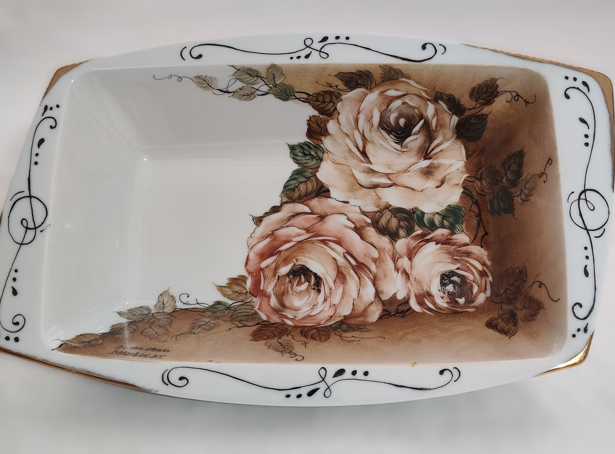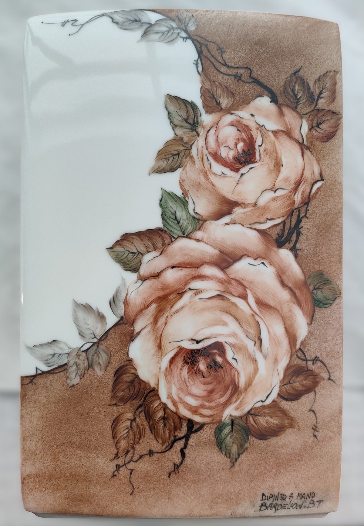 La moderna coppia di vaso e centrotavola, realizzati con la tecnica "olio molle cottura terzo fuoco" e rifiniti con dettagli in oro zecchino, è perfetta per un tocco di eleganza e stile contemporaneo. La loro forma rettangolare e i delicati ghirigori eseguiti a pennino si distinguono su uno sfondo di tamponatura, impreziosito da rose d'autunno. Gusta il connubio perfetto tra modernità ed eleganza con questa coppia unica.