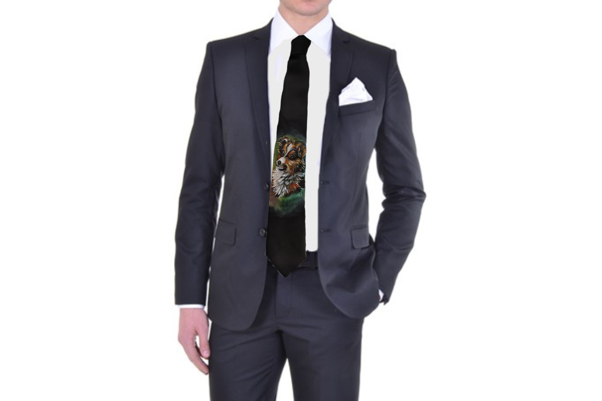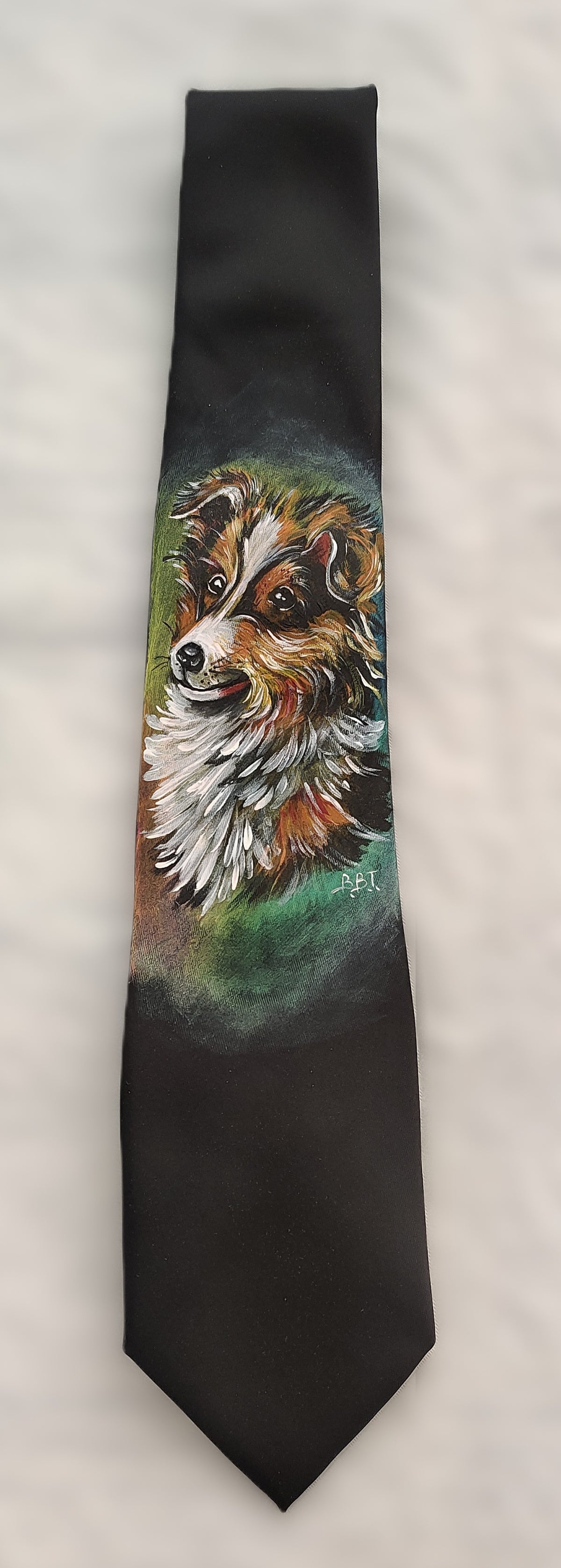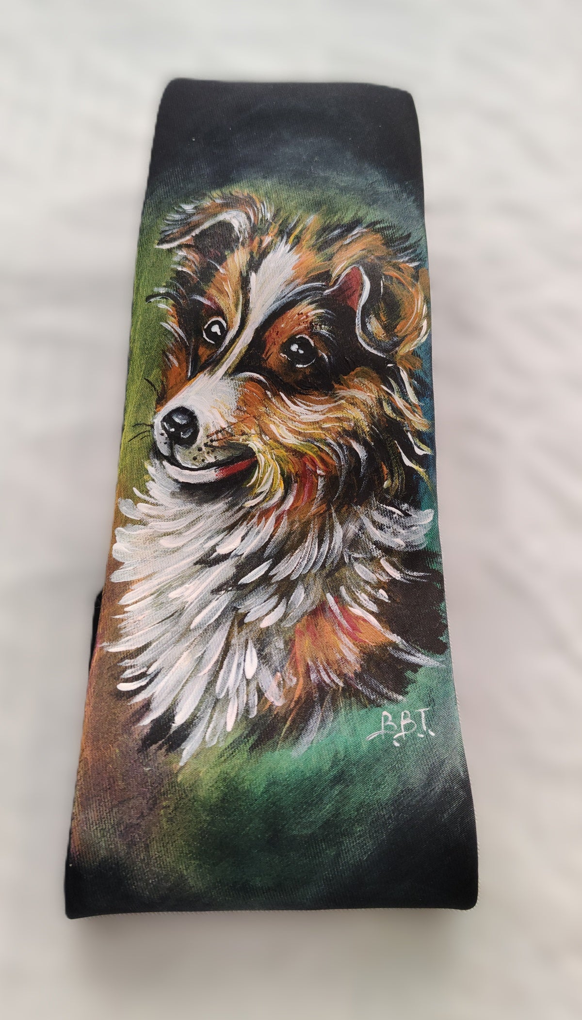 Cravatta artigianale su sfondo nero con raffinato dipinto a mano di un cagnolino, realizzata con meticolosa attenzione ai dettagli. Ogni pennellata è eseguita con precisione artistica, conferendo un carattere unico e distintivo a questo accessorio. Un'opera d'arte indossabile che unisce eleganza e originalità.