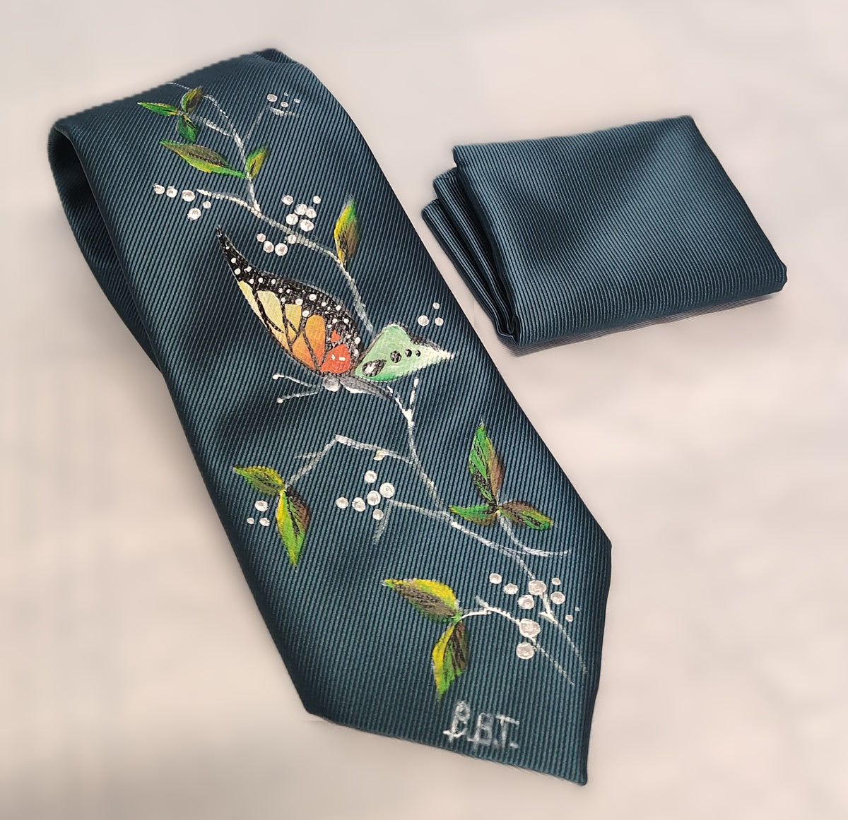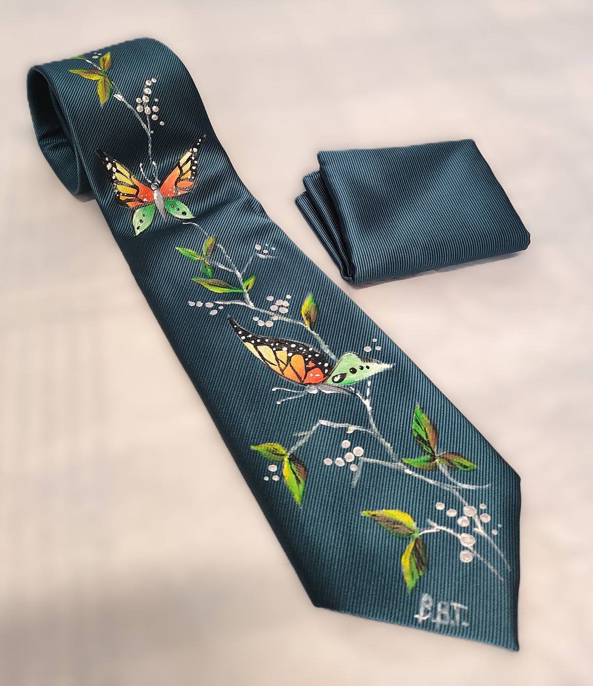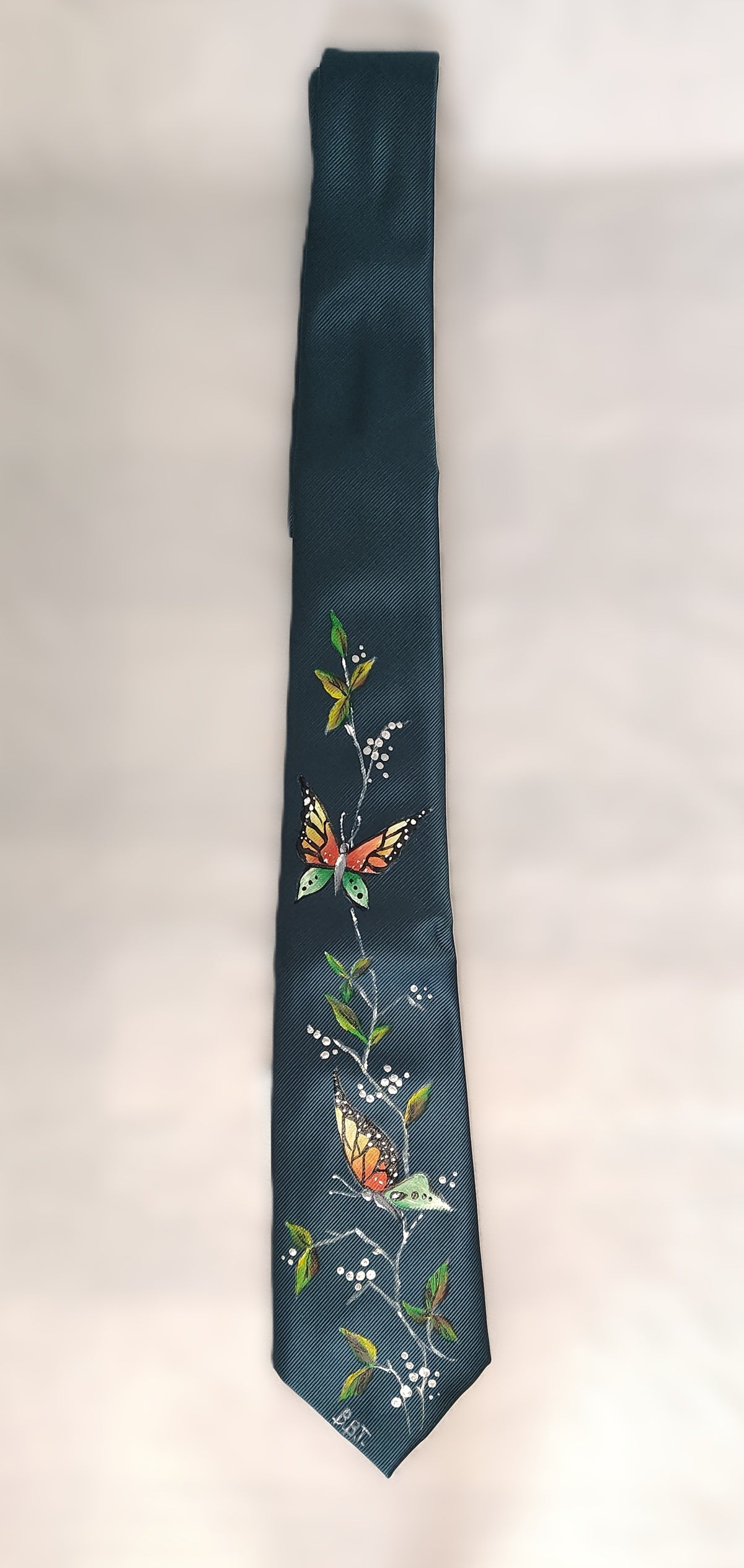 Aggiungi un tocco di eleganza al tuo look con la nostra cravatta farfalle nel verde. Questa cravatta dipinta a mano presenta bellissime farfalle dai colori accesi, che si abbinano perfettamente ai petali e fiori sullo sfondo. L'accessorio perfetto per un look sofisticato e raffinato.