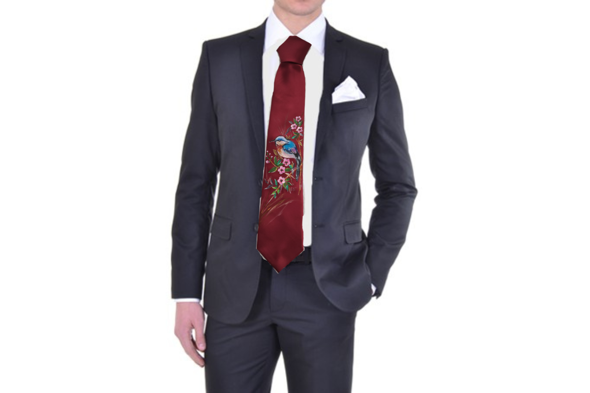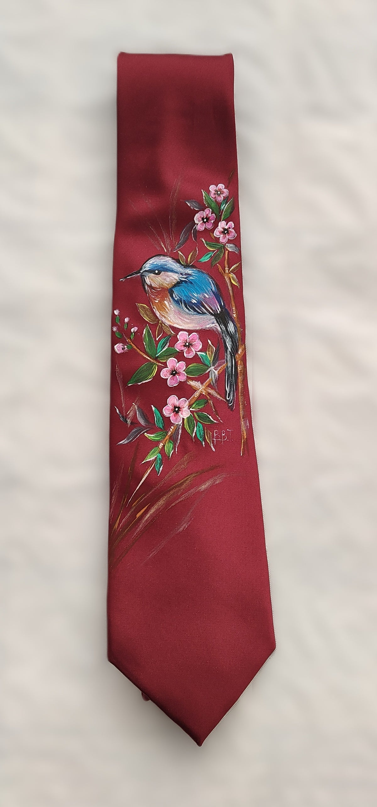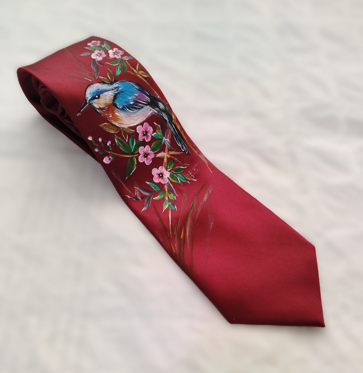 Questa pregiata cravatta bordeaux si distingue per il raffinato dipinto a mano che ritrae un uccellino posato su un ramo fiorito di pesco. Ogni dettaglio dell'illustrazione è eseguito con maestria artigianale, conferendo all'accessorio un carattere unico e sofisticato. La combinazione tra il caldo tono di fondo e la delicatezza del soggetto naturalistico crea un equilibrio perfetto tra eleganza classica e ricercatezza artistica.