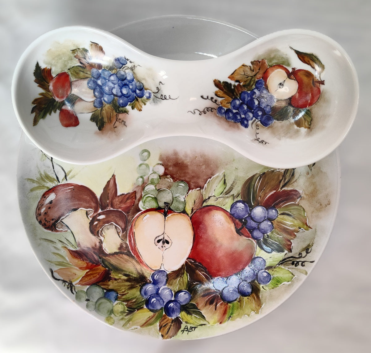 Questo piatto da portata con antipastiera integrata unisce funzionalità ed estetica, arricchendo la presentazione degli antipasti con dettagli ispirati alla natura e alla gastronomia. Perfetto per chi desidera servire con eleganza, si presta anche come raffinato elemento decorativo per valorizzare ogni ambiente domestico.