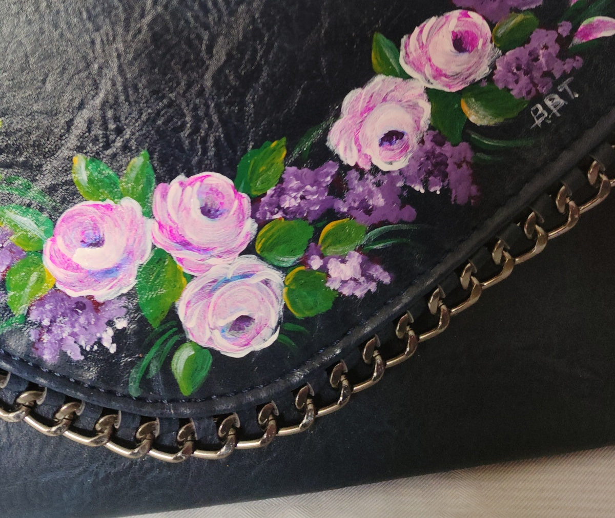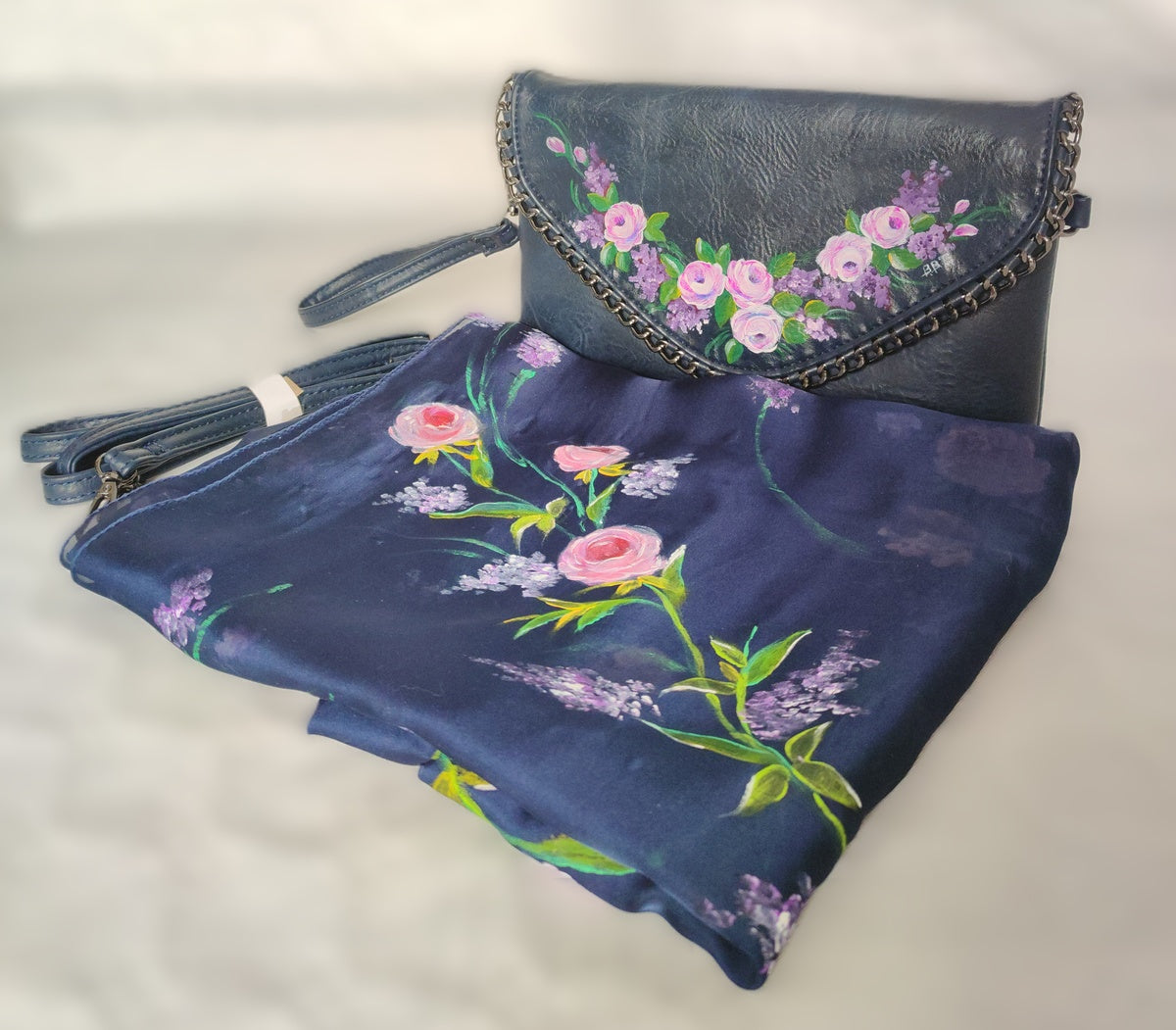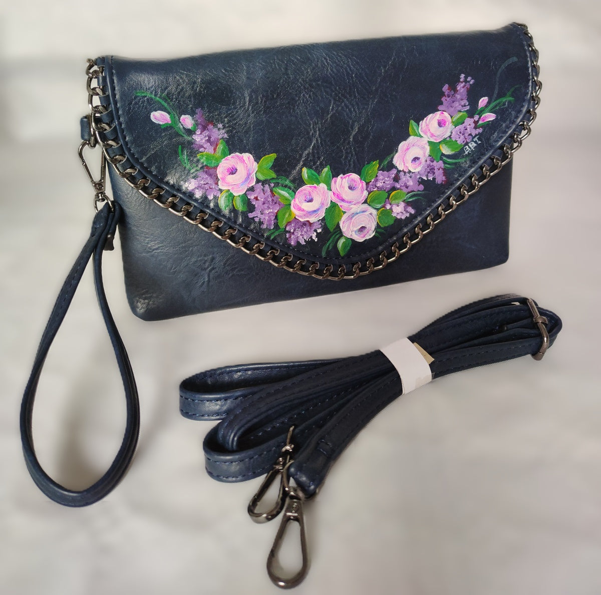 Questa pochette in ecopelle presenta uno sfondo blu impreziosito da rose eleganti dipinte a mano, che ne esaltano la raffinatezza. Completa di tracolla e stola in seta coordinata, è la scelta ideale per cerimonie importanti, unendo stile e funzionalità con un tocco di classe artigianale.