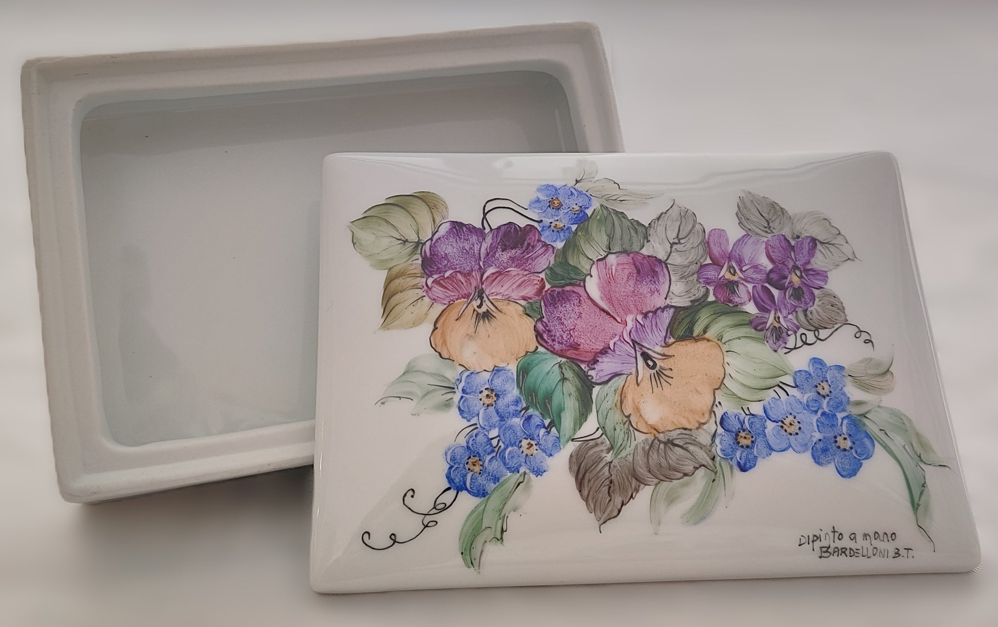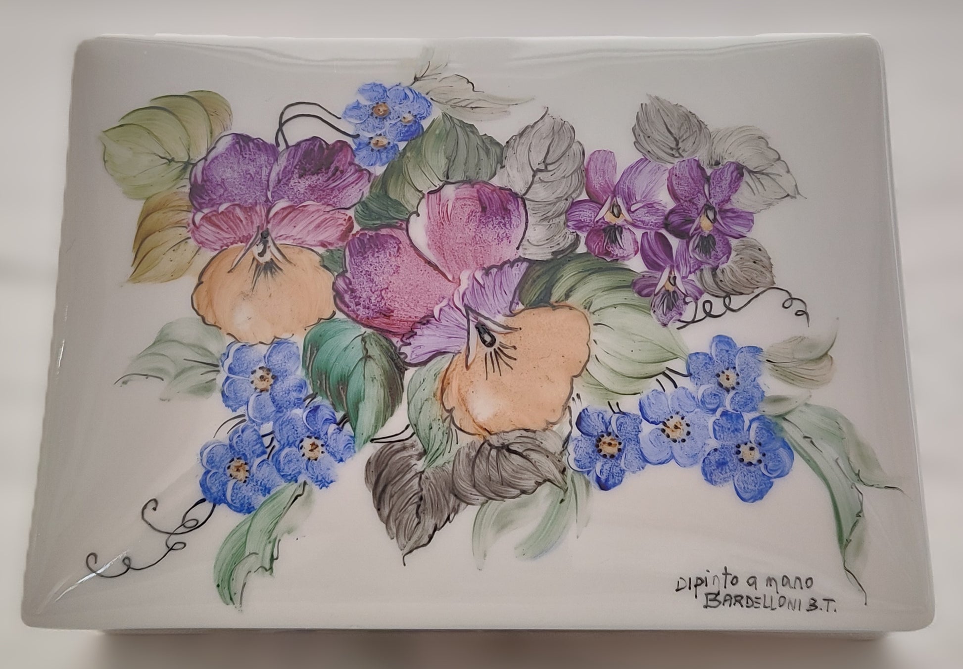 Portagioie rettangolare con ricami di fiori dipinti a mano. Conserva i tuoi preziosi gioielli con stile e arte. Realizzato a mano con delicatezza, questo portagioie è un'elegante aggiunta a qualsiasi collezione di accessori. Presenta un design unico e dettagli che riflettono l'abilità artigianale italiana.