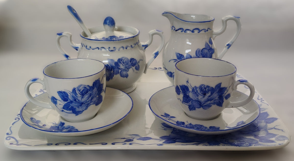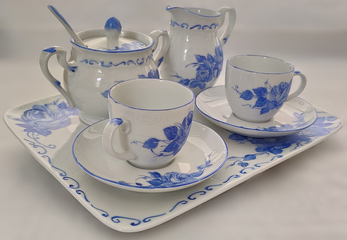 Questo raffinato set "Tet a tet rose blu" è ideale per gustare il caffè in compagnia, aggiungendo un tocco di eleganza alle vostre occasioni speciali. Il design curato e i dettagli sofisticati rendono ogni momento di condivisione unico e memorabile. Perfetto per chi cerca qualità e stile in un servizio da caffè esclusivo.