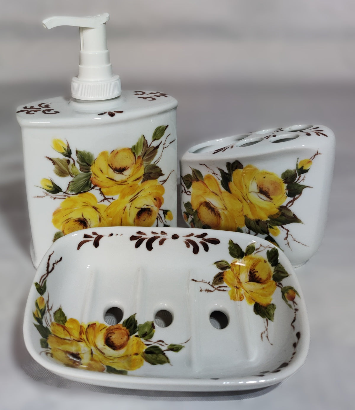 Questo trittico bagno unisce funzionalità ed eleganza, comprendendo porta spazzolini e dentifricio, porta saponetta e dispenser per sapone liquido. Le rose gialle, dal design raffinato, donano un tocco di colore e stile all’ambiente, rendendo l’insieme perfetto per chi cerca praticità senza rinunciare all’estetica.